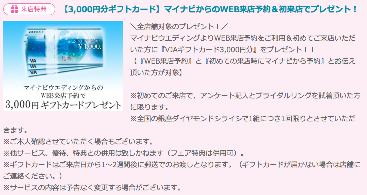 マイナビのキャンペーンとは別で来店予約で3,000円分のギフトカードがもらえる来店特典をほぼ通年で実施しています。(細かい条件は予約前に確認してください)