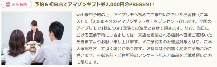 アイプリモの場合はマイナビのキャンペーンとは別でAmazonギフト券2,000円分をプレゼントしています。アイプリモもほぼ通年で実施しています。(細かい条件は予約前に確認してください)