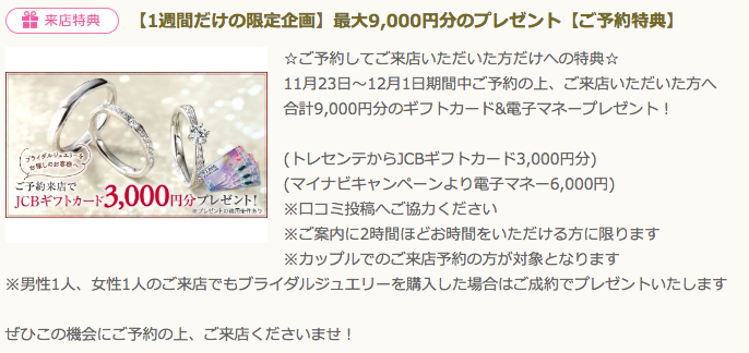 トレセンテの場合は一見すると9,000円分のギフト券プレゼントのように見えますが、マイナビが実施している来店6,000円との合わせ技という表記なので注意が必要です。