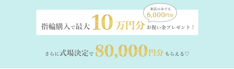 まず、ダントツでお得なお買い物ができるのはマイナビウエディングのキャンペーンを利用した場合です。マイナビウエディングを使ってブライダルジュエリーショップを予約して、その後購入に至ると最大で10万円のお祝い金(金券)をもらうことができます。